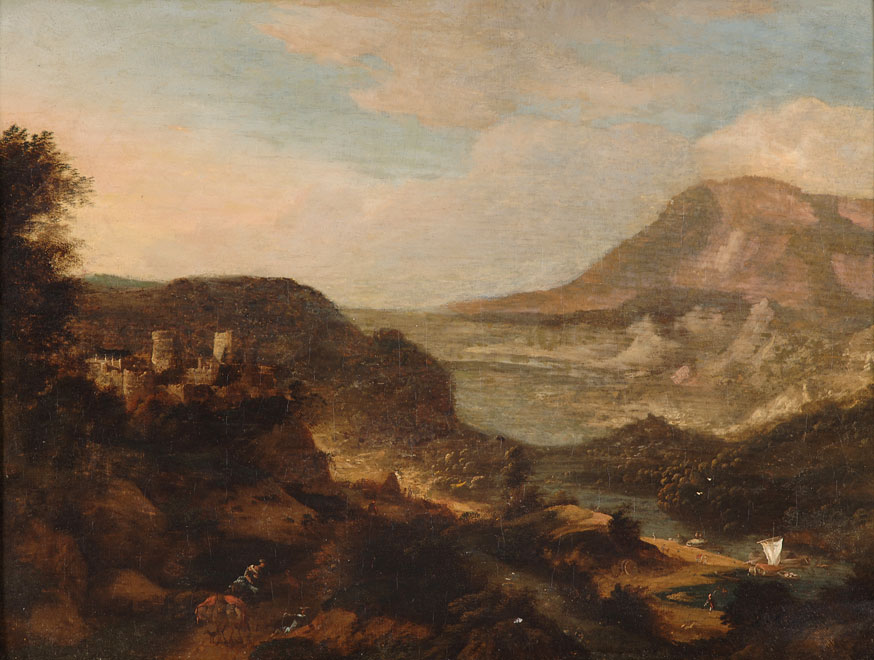 401Unbekannter Meister 19. Jhdt.Weite Flußlandschaft mit Hirten und Weidevieh. Öl/Lwd./doubl., 52 x 62 cm 200 EUR |