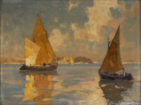 213Hambüchen, Wilhelm 1869 Düsseldorf - 1939 ebenda Anlandung der Fischerboote. Signiert. Öl/Holz, 27,5 x 42 cm 300 EUR |