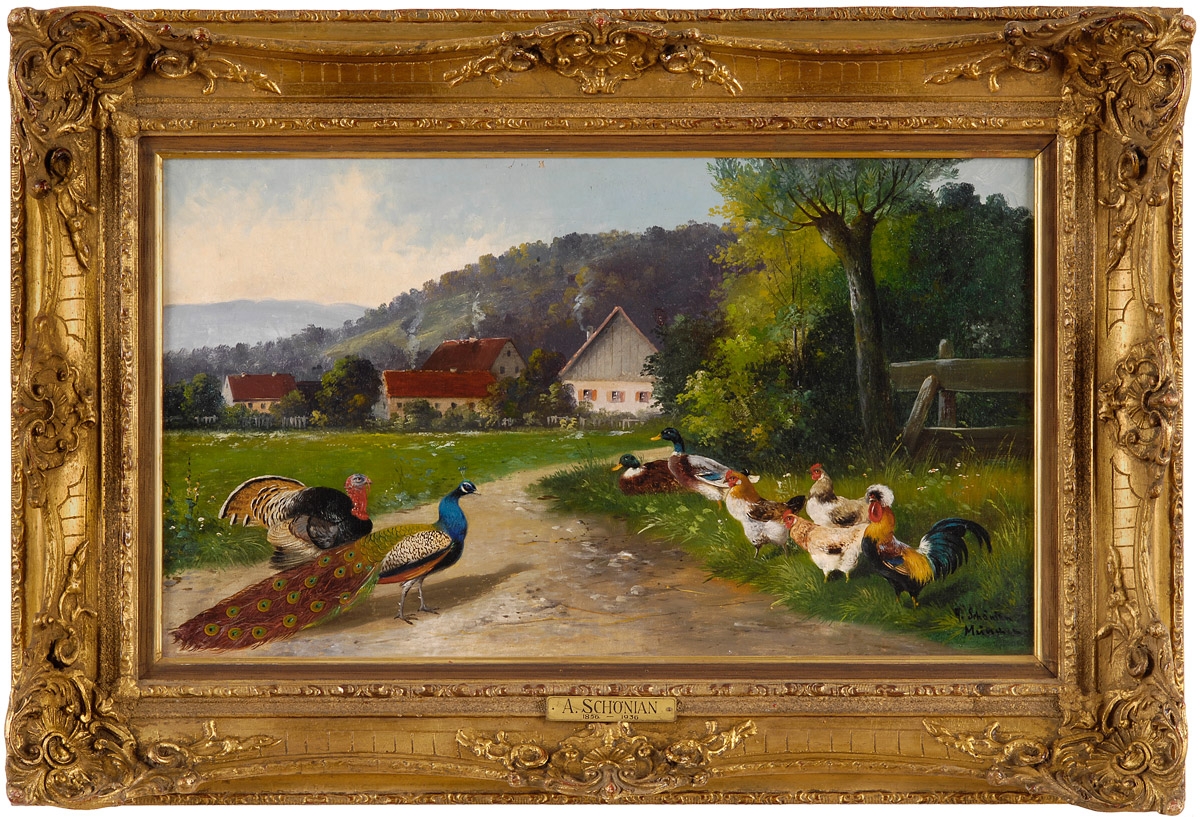 453Schönian, Alfred 1856 Frankfurt - 1936 München Buntes Federvieh. Signiert. Öl/Lwd., 32 x 56 cm 500 EUR |