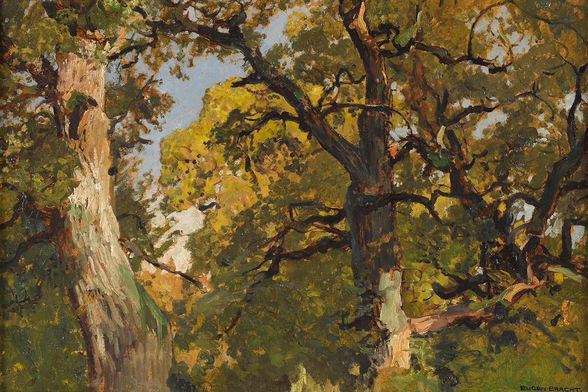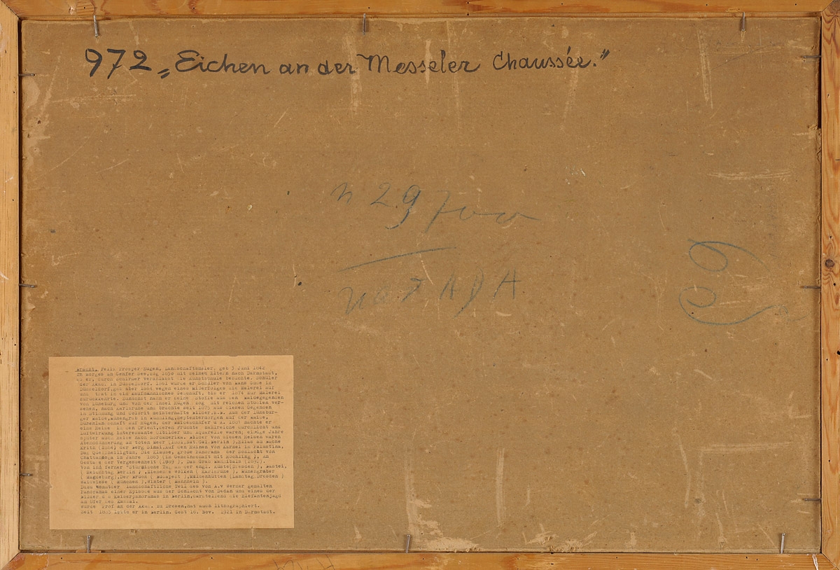 4Bracht, Eugen 1842 Morges - 1921 Darmstadt Eichen an der Messeler Chaussée. Signiert. Rückseite betitelt und nummeriert 972. Öl/Malk., 46 x 68 cm 500 EUR |