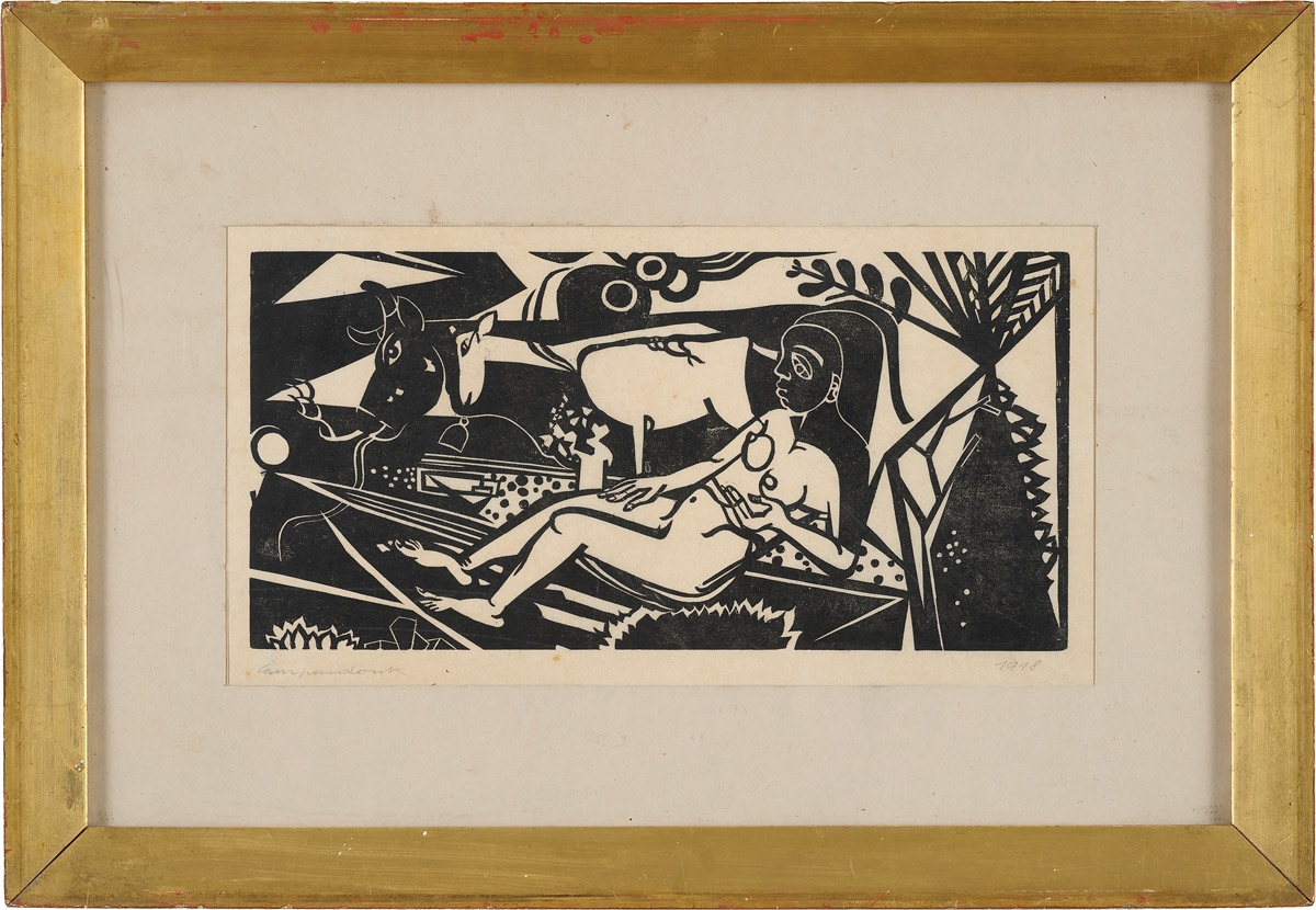 7Campendonk, Heinrich 1889 Krefeld - 1957 Amsterdam Liegender weiblicher Akt mit Kuh und Ziege. Signiert. Datiert 1918. Holzschnitt. 19 x 35 cm (sichtbare Größe) 600 EUR |