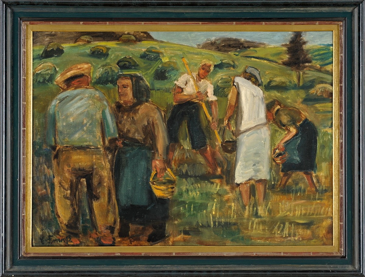 32Fraaß, Erich 1893 Glauchau - 1974 Dresden Landarbeiter. Signiert. Öl/Lwd., 73 x 100 cm. Verso: Feldarbeiter. 600 EUR |