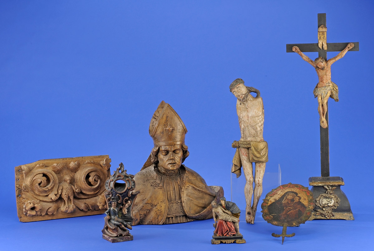 1460Konvolut, sieben Teile 17./18. Jhdt. Holz geschnitzt u. z.T. gefasst. Metall. H 84 cm und kleiner. 150 EUR |