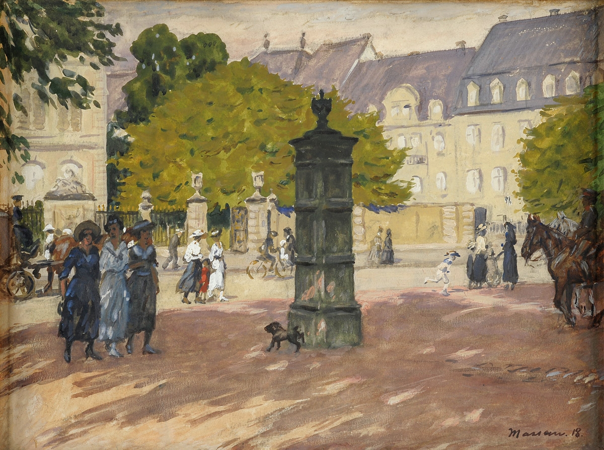85Massau, Edmund 1860 Düsseldorf - 1935 Düsseldorf Am Jägerhof. Signiert. Datiert (19) 18. Rückseite betitelt, Gouache. 32 x 42 cm 200 EUR |