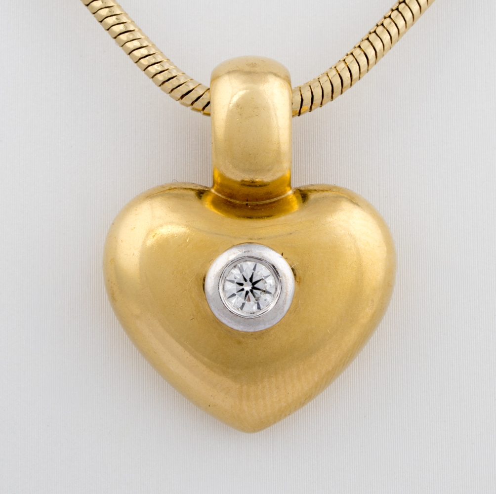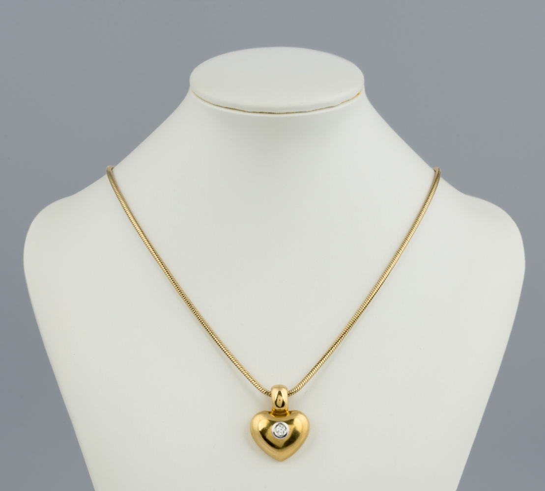 750-Anhänger mit Brillant, 0,25 ct im oberen Farb- und Reinheitsbereich, L 3,2 cm, 15 g. Kette: 585-Gold, L 49 cm, 20 g.