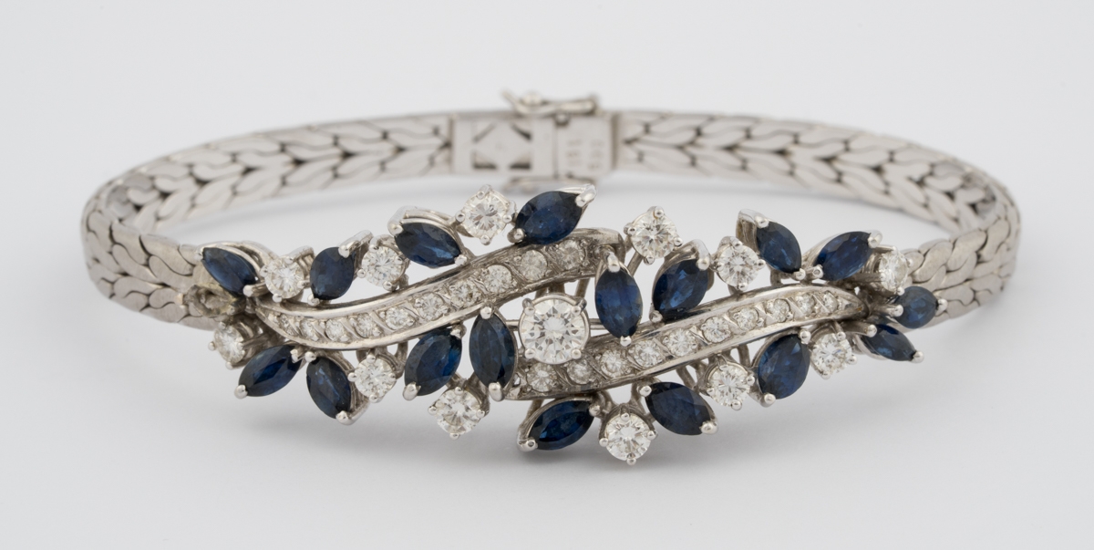 750-Weißgold, Safire und Brillanten im oberen Farb- und Reinheitsbereich. L 18 cm, 32,5 g.