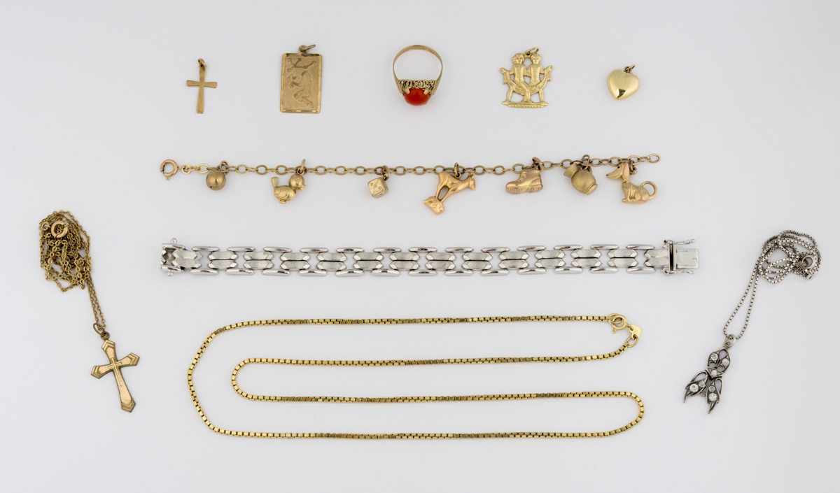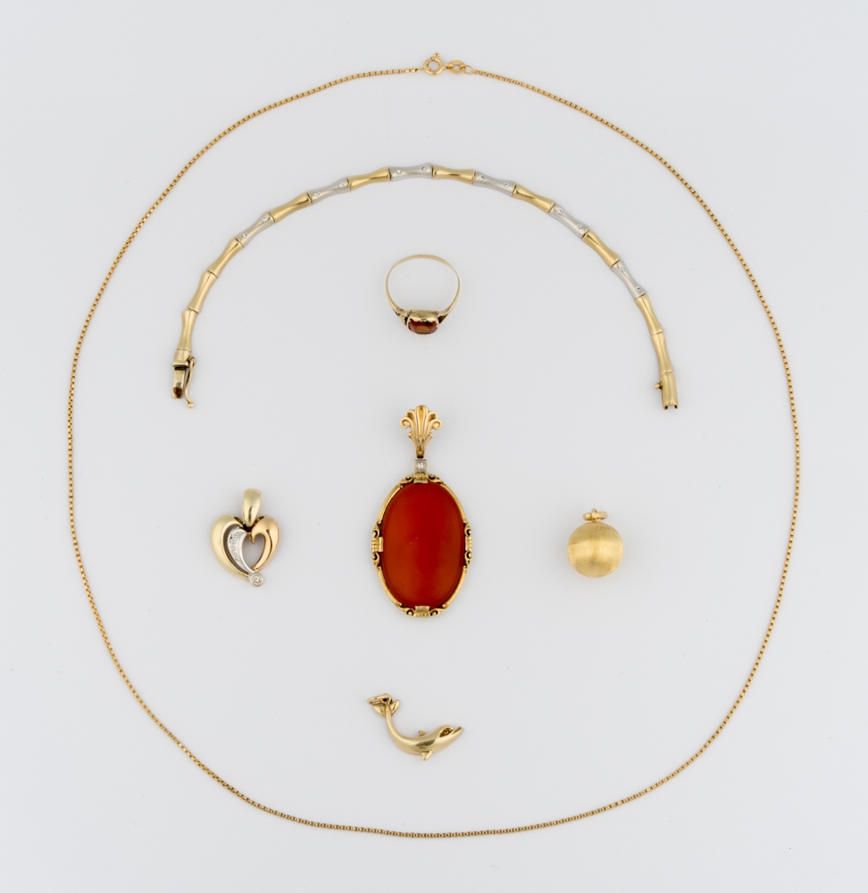 Collier, Armband, Ring, kl. Anhänger und Anstecker mit 333-Goldfassungen. Collier: L 38 cm.