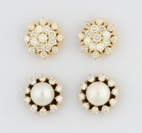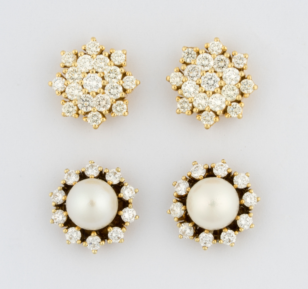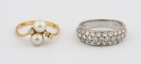 750-Gold, Brillanten und zwei Perlen.