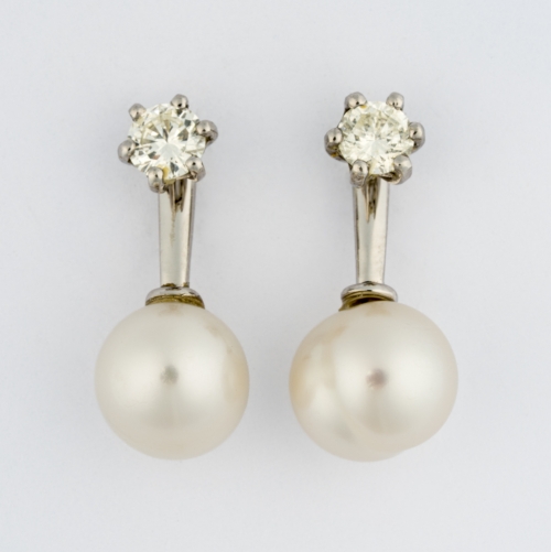 585-Weißgold, je ein Brillant und Perle. L 2,3 cm.