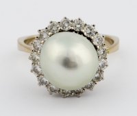 585-Weißgold, eine Perle und 18 Brillanten.