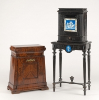 1009Kleiner Kabinettschrank mit Keramikplaketten um 1870 und kl. Biedermeierschränkchen. 100 EUR |