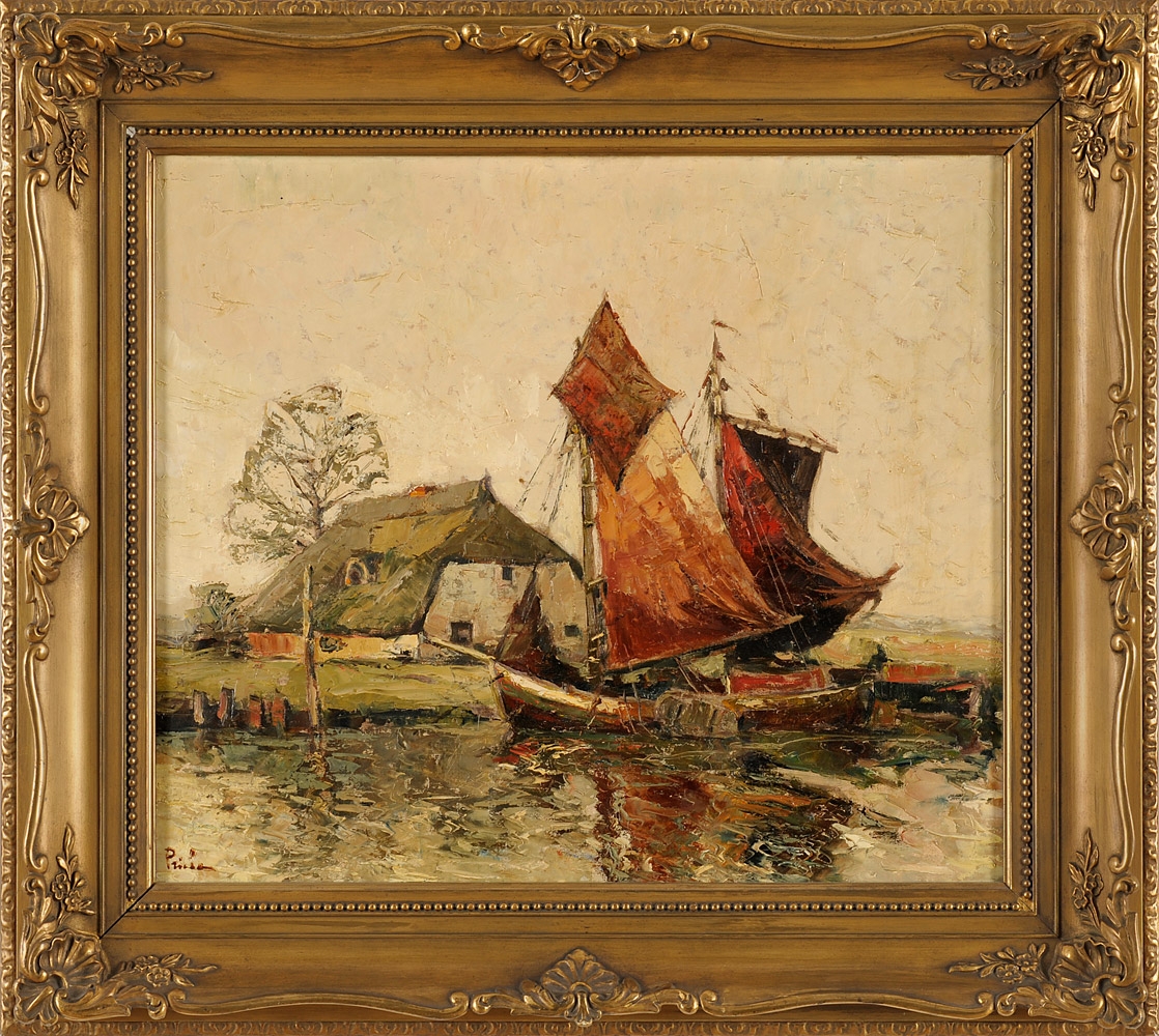 587Priebe, Rudolf 1889 Schulakowo - 1964 Hamburg Kanallandschaft mit Fischerboot. Signiert. Öl/Lwd., 50 x 60 cm 150 EUR |