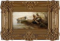 597Raupp, Karl 1837 Darmstadt - 1918 München Der Plausch am Seeufer. Signiert. Öl/Mahagoni, 13 x 26 cm 800 EUR |