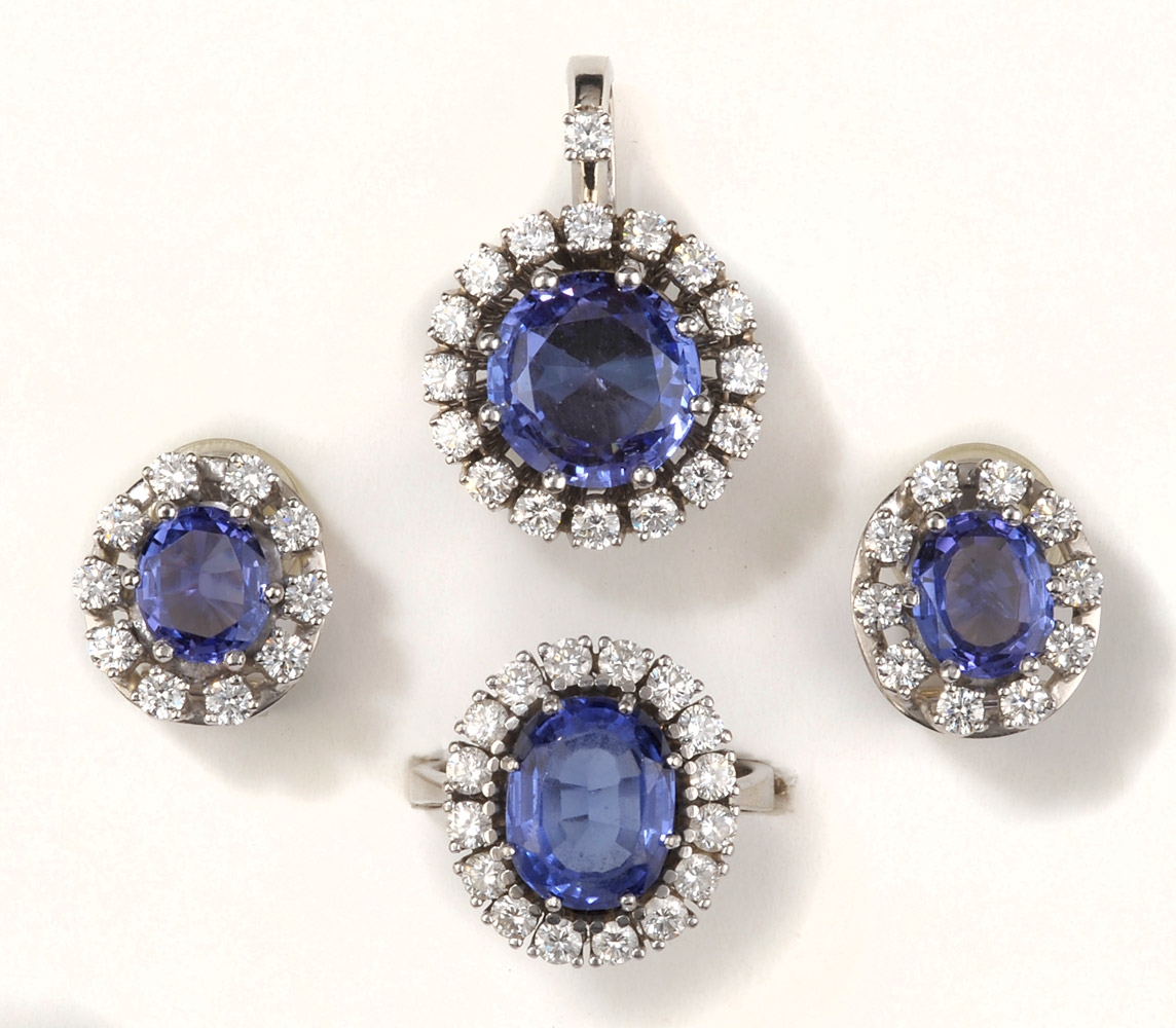 1195Ring, Anhänger und ein Paar Ohrclips 750-Weißgold, Brillanten im oberen Farb- und Reinheitsbereich. Safire? (ungeprüft). 600 EUR |