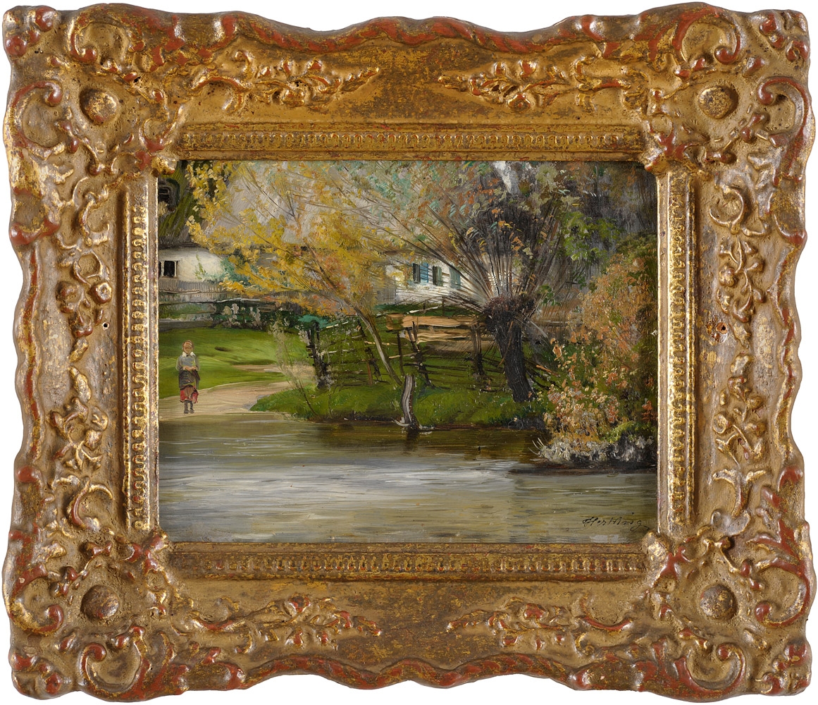 Hertling, Wilhelm Jakob 1849 Katzenelnbogen - 1926 München Mädchen am Dorfweiher. Signiert. Öl/Malk., 18 x 22 cm