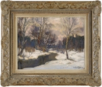 Domaradzki, Stefan 1897 Nizhny Novgorod - 1983 Nandy Winterliche Flusslandschaft. Signiert. Datiert 1947. Öl/Lwd./Platte, 29 x 36,5 cm