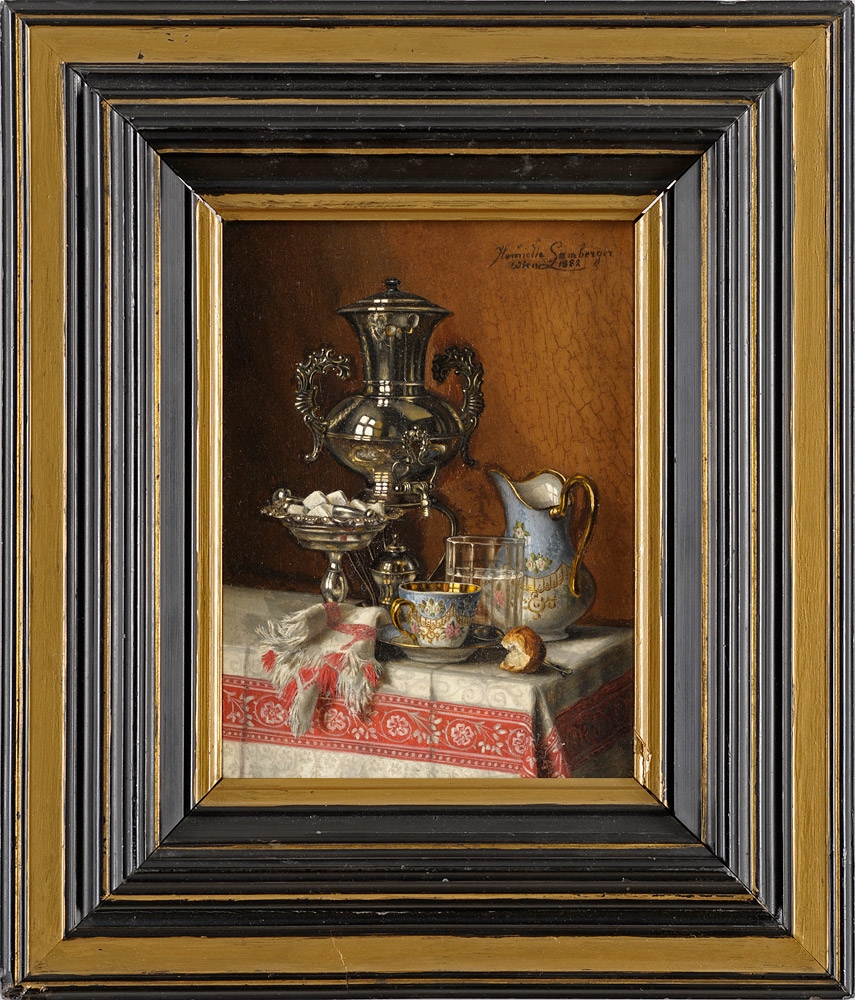 Lamberger, Henriette 1859 Troppau - nach 1900 Wien Stillleben mit Silbersamowar. Signiert. Datiert 1882. Öl/Holz, 16,5 x 12 cm