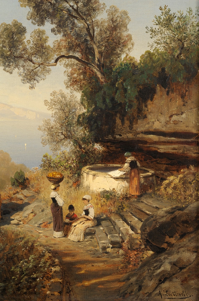 Lutteroth, Ascan 1842 Hamburg - 1923 Moskau Wäscherinnen an einem Brunnen im Hintergrund Capri. Signiert. Öl/Lwd., 60 x 50 cm