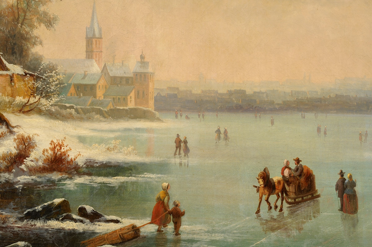 Nagel, J. Datiert 1871 Zwei Gemälde. Wintervergnügen. Sommerliche Flusslandschaft. Signiert. Öl/Lwd., je 74 x 104 cm
