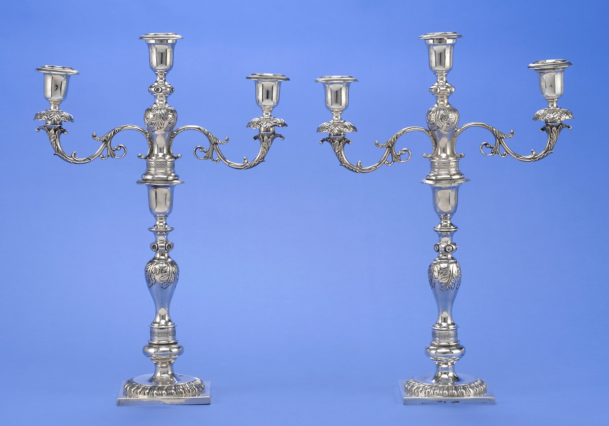 1016Ein Paar Girandolen Russland 1852 Dreiflammig. Abnehmbare Leuchteraufsätze. Punzen. 84-Zolotnik. H 48 cm, zus. 2461 g. 1500 EUR |