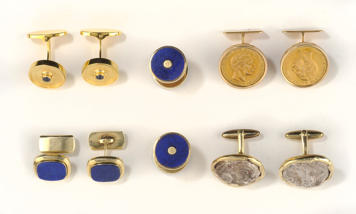 1143Konvolut 16 Teile 750-/585- und 333-Feingehalte, zus. 133 g. Zwei Ketten und zwei Paar Manschettenknöpfe 333-Gold, zus. 25 g. 600 EUR |