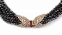 120Achtreihiges Collier mit Hämatiten und ein Paar Ohrclips 1200 EUR |