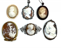148Sammlung von sechs Brosch-/Anhängern mit Muschelkameen 19./20. Jhdt. 150 EUR |