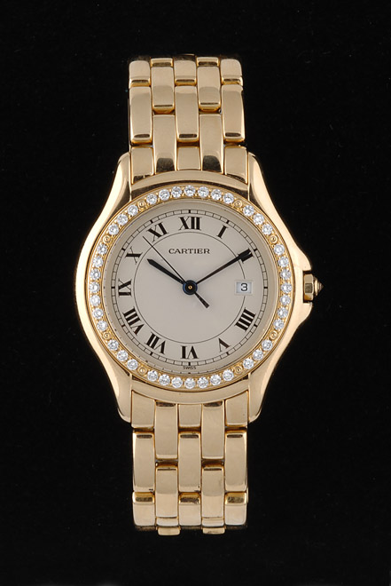 1841Damenarmbanduhr von Cartier (Cougar)750-Gelbgoldgehäuse und -armband. Lunette besetzt mit 40 Brillanten. Datumsanzeige. 3800 EUR |