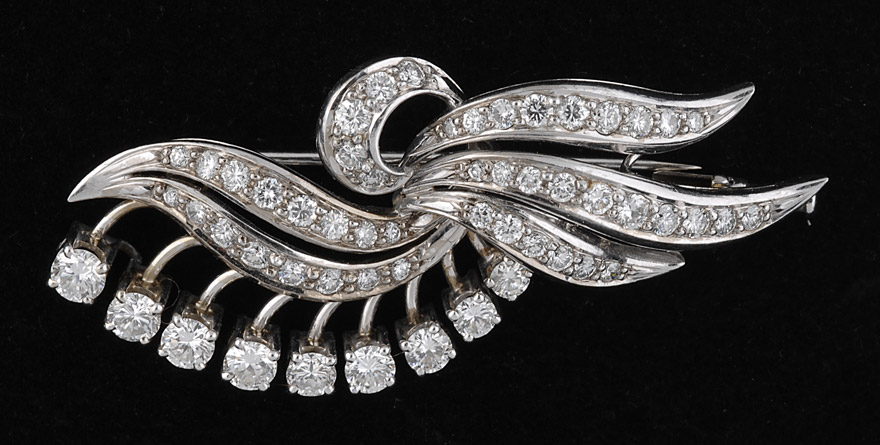 1814Brillant-Anhänger585-Weißgold, drei zentrale Brillanten, zus. Ca. 1,90 ct, tw/vvsi und 20 kl. Brillanten, zus. ca. 1,50 ct 3000 EUR |