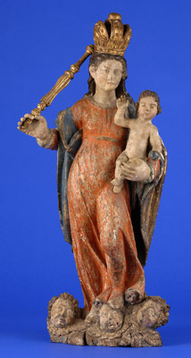 1043Madonna mit Kind Österreich, 18. Jhdt.Mit Zepter und Krone dargestellt. Vollrund ausgeführt. Alte Farbfassung und Vergoldung. H 89 cm 200 EUR |