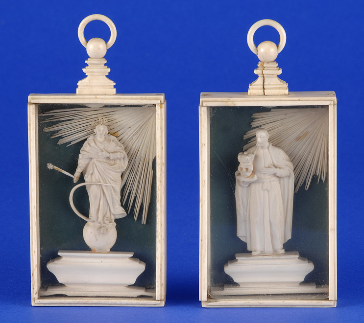 1028Heiliger Antonius mit Christusknaben 18. Jhdt.Vollrund geschnitzt. Sockel mit Reliquie. H 44 cm (gesamt) 150 EUR |