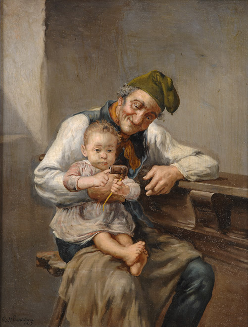 58Burger, Adolf 1833 Warschau - 1876 BerlinDas Spiel mit der Garnspindel. Signiert. Datiert 1873. Öl/Holz, 34 x 25,5 cm 600 EUR |