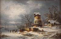 51Brügner, Cölestin 1824 Berlin - 1887 ebendaWinterliche Flußlandschaft mit Windmühle. Signiert. Öl/Malk., 14 x 21 cm 900 EUR |