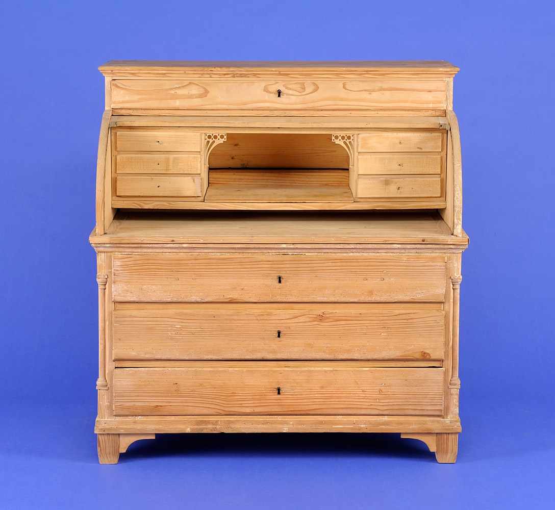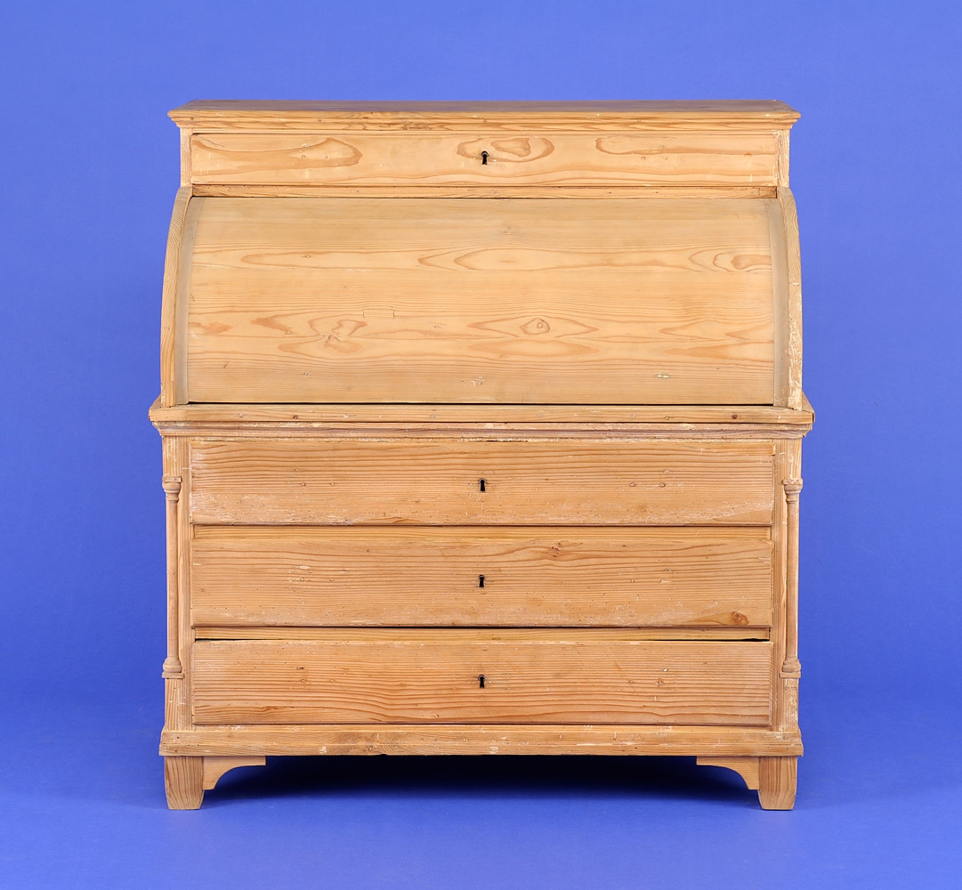 1679Zylindersekretär Deutsch um 1820 Vierschübiger Nadelholzkorpus. Innen mit sechs Schüben und Geheimfach. H 120 cm, B 110 cm, T 63 cm 100 EUR |