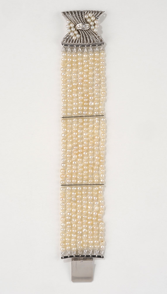 1073Perlarmband Achtreihig. 750-Weißgoldschließe und -zwischenstücke. Vier Diamanten. L 18 cm 300 EUR |
