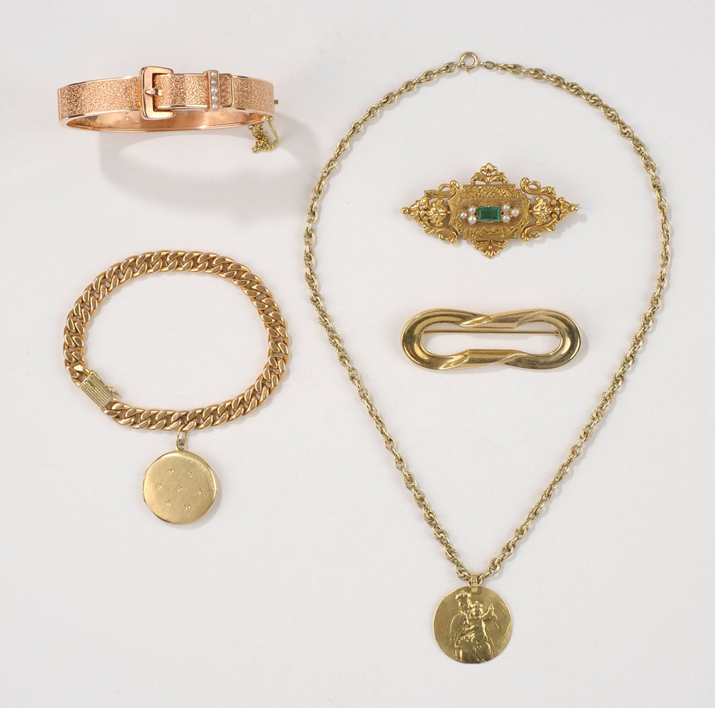 1077Konvolut Sieben Teile Armband mit Anhänger, Armreif, zwei Broschen und Kette mit Anhänger. 585-Gelbgold, zus. 58 g. 500 EUR |