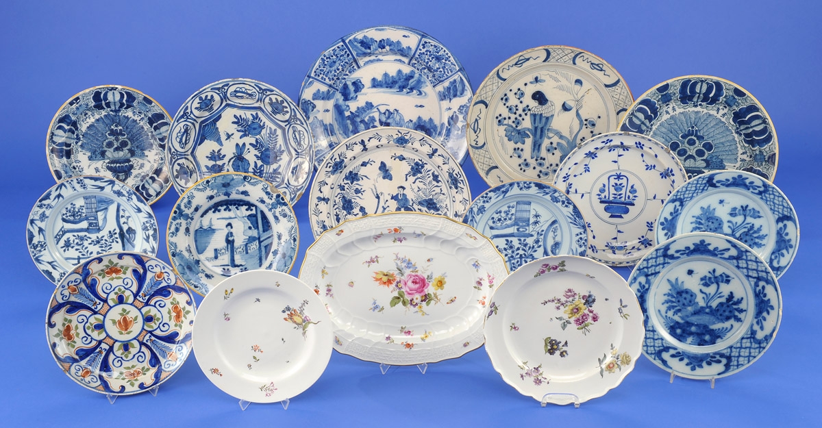 1577Konvolut 16 Teller und Platten Überwiegend Delft 18. Jhdt. Drei Teile Meissen 18./19. Jhdt. Ø 37 cm und kleiner. 200 EUR |