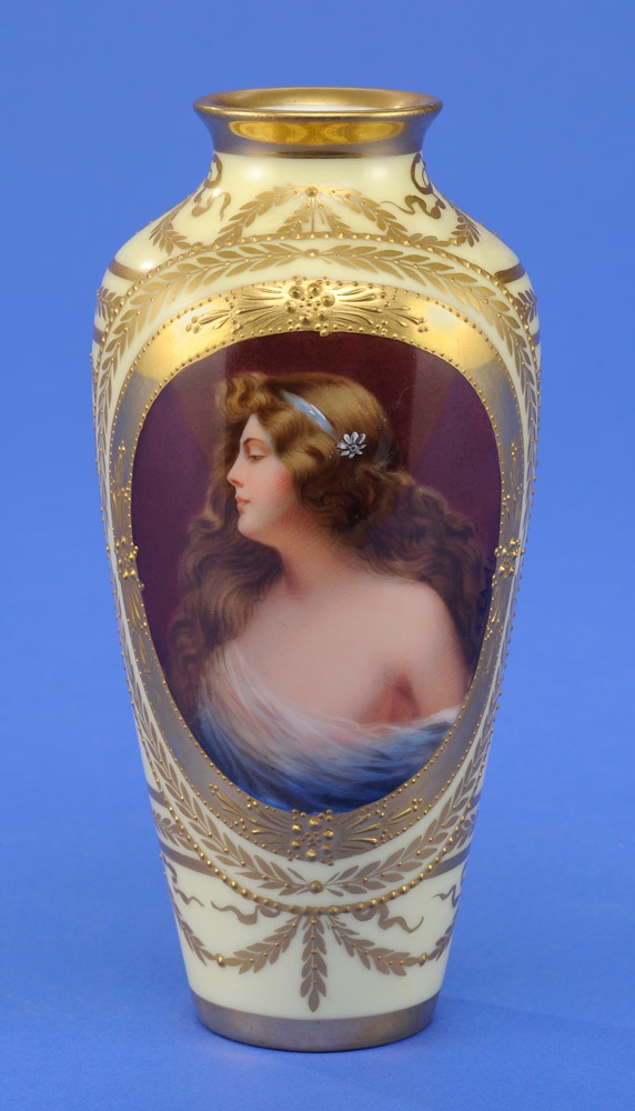 1555Venuswagen Meissen, Ende 19. Jhdt. Bunt staffiert und ziervergoldet. Min. best u. rest. Schwertermarke. H 24 cm 300 EUR |