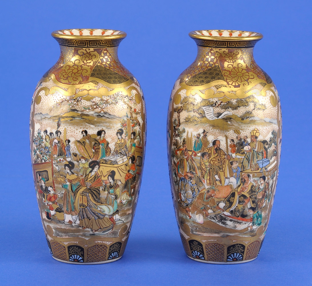 1569Ein Paar kl. Satsuma-Vasen Japan, Meiji um 1900 Umlaufendes Personen- und Insektendekor. Vergoldet. H 12 cm 200 EUR |