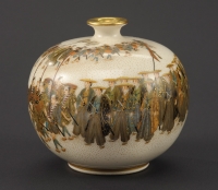 1565Feine Satsuma-Vase Japan, Meiji 1868-1912 Umlaufender Samuraizug mit Schrein. Vergoldet. Bodenmarke. H 7,5 cm 800 EUR |