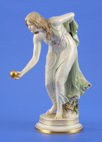 1581Kugelspielerin Meissen, Ende 19. Jhdt. Nach einem Entwurf von Walter Schott (1861-1938), 1897. Bunt staffiert und vergoldet. Schwertermarke. Beizeichen. H 36 cm 600 EUR |
