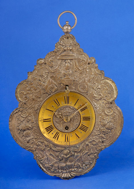 1014Wanduhr (Tellerzappler) Süddeutsch, erste Hälfte 18. Jhdt.Silberblech auf Eisenplatte. Messingziffernring. Messingwerk mit Spindelgang. Federantrieb. H 47 cm 300 EUR |