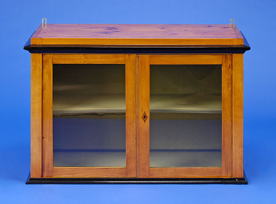 1032Halbschrank Deutsch um 1830Zweitüriger Korpus mit vorspringendem Stirnschub, begrenzt von Halbsäulen. Nußbaum, Nußbaum-Maser. H 89 cm, B 103 cm, T 50 cm 400 EUR |