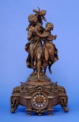 1025Pendule nach einem Modell von Mathurin Moreau Ende 19. Jhdt.Metall, patiniert. Signiert. Zifferblatt mit römischen Emailkartuschen. Messingwerk. H 82 cm 600 EUR |