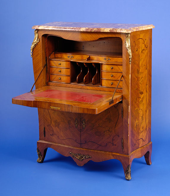 1045Aufsatzsekretär Dresden, erste Hälfte 18. Jhdt.Dreischübiges Unterteil mit schräg gestellter Schreibklappe. Innen mit acht Schüben und Bodenfach. Passiger Aufsatz mit verspiegelten Türen. Innen mit drei Schüben, Fächereinrichtung und verspiegelter Zentraltüre. Ergz. Nußbaum. H 206 cm, B 103 cm, T 60 cm 2000 EUR |