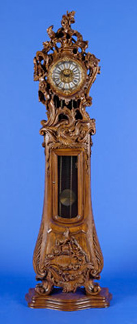 1021Standuhr mit Spielwerk auf acht TonfedernDurchbrochen geschnitztes Gehäuse im Rokokostil. H 200 cm 150 EUR |