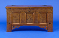 1049Flachdeckeltruhe mit geschnitzter SchauseiteEichenkorpus mit Eisenbeschlag. H 83 cm, B 146 cm, T 58 cm 150 EUR |