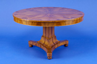 1037Biedermeier-Tisch Um 1830Runde Platte mit Zargenreif auf Säulenfuß mit dreiseitig konkav eingezogener Sockelplatte. Nußbaum. Ergz. H 74 cm, Ø 128 cm 150 EUR |