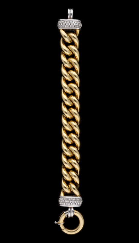 1216Armband 750-Weiß-/Gelbgold, besetzt mit 62 Brillanten, L 23 cm, 121 g. Auktion: Donnerstag, 05.12.2013 ab 12:00 1200 EUR |