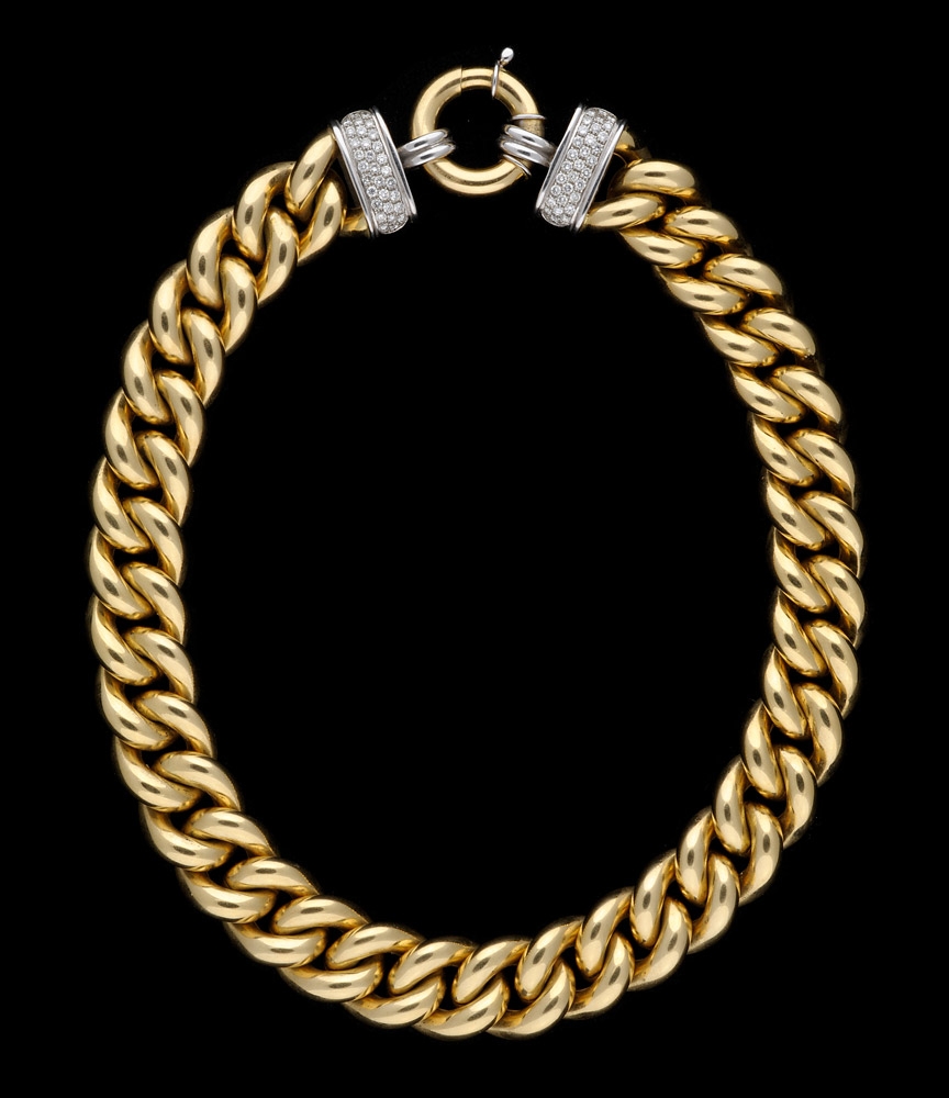 1217Collier 750-Weiß-/Gelbgold, besetzt mit 62 Brillanten, L 45,5 cm, 242 g. Passend zur vorhergehenden Position. Auktion: Donnerstag, 05.12.2013 ab 12:00 2400 EUR |